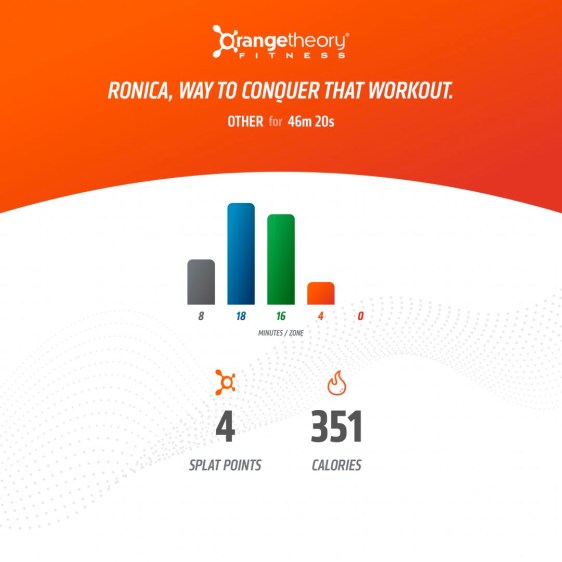 Per OTF, the “Orange Zone (84-91% Maximum Heart Rate) – This is where the magic happens and where you achieve “EPOC” (Excess Post-Exercise Oxygen Consumption) – what we call the “Orange Effect / Afterburn.” The goal is to accumulate 12 minutes or more in this zone within a 60-minute period to achieve the maximum caloric burn for up to 36 hours AFTER your workout is completed.”